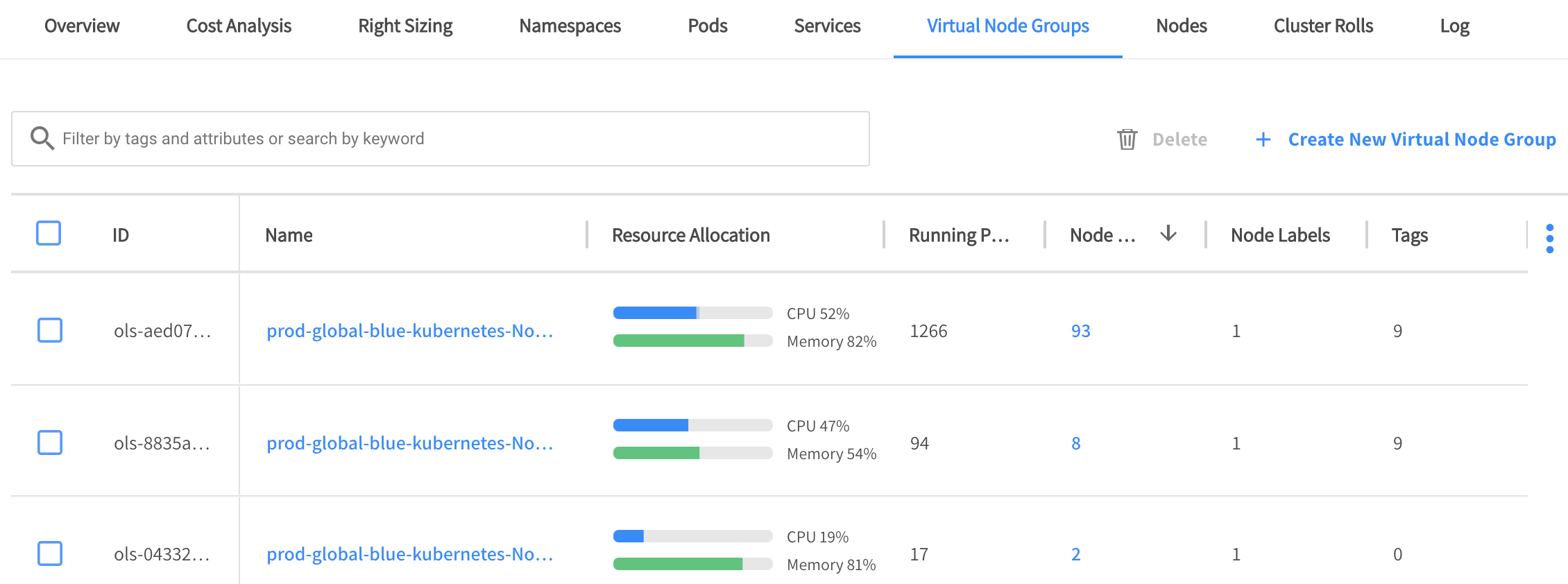 Click the Virtual Node Groups tab. The Virtual Node Groups tab opens and displays a summary of all the VNGs defined in the Ocean cluster.